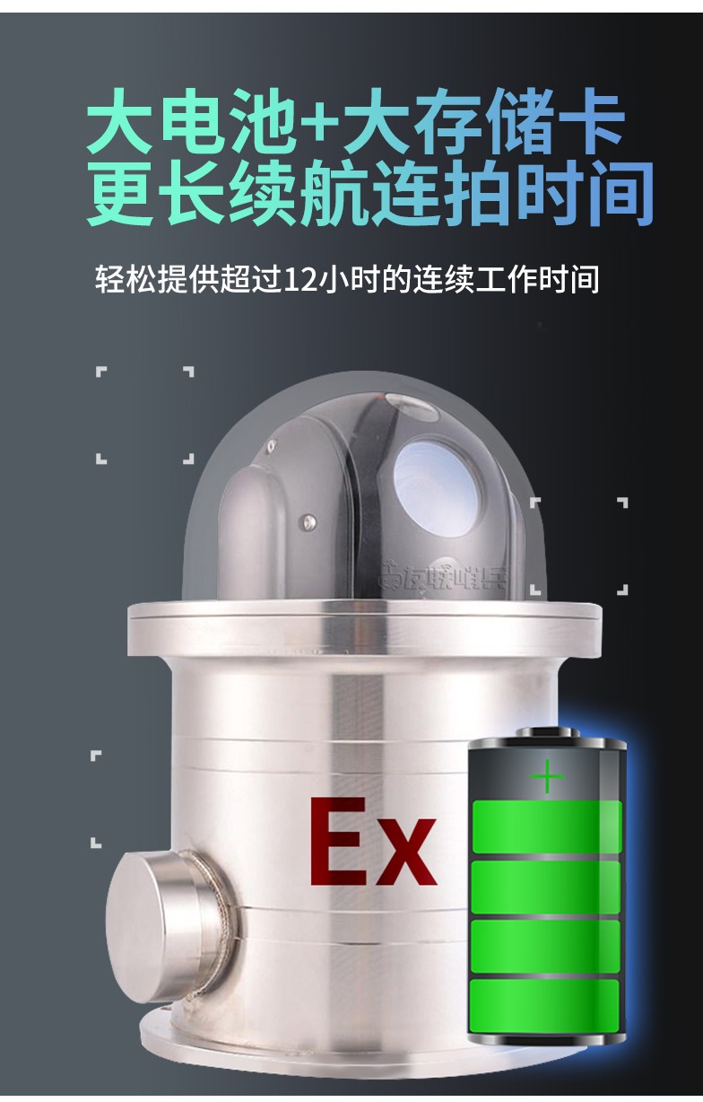 友聯哨兵 ULH-Ss12Ex 防爆布控球是一款具備防爆功能的一體化無線視頻應急指揮系統,專為特定行業(如石油、煉化、化工、燃氣等危險化學和易燃易爆行業)設計。產品內置高清攝像機及高性能鋰電池組,通過無線網絡方式回傳至控制終端,具備防水防震防爆等特性,攜帶便捷,可快速安裝和收納,完全滿足石油、化工等作業區的移動巡檢、無人值守、臨時監控、應急指揮的應用需求。