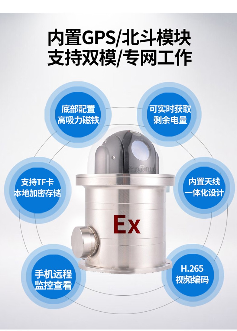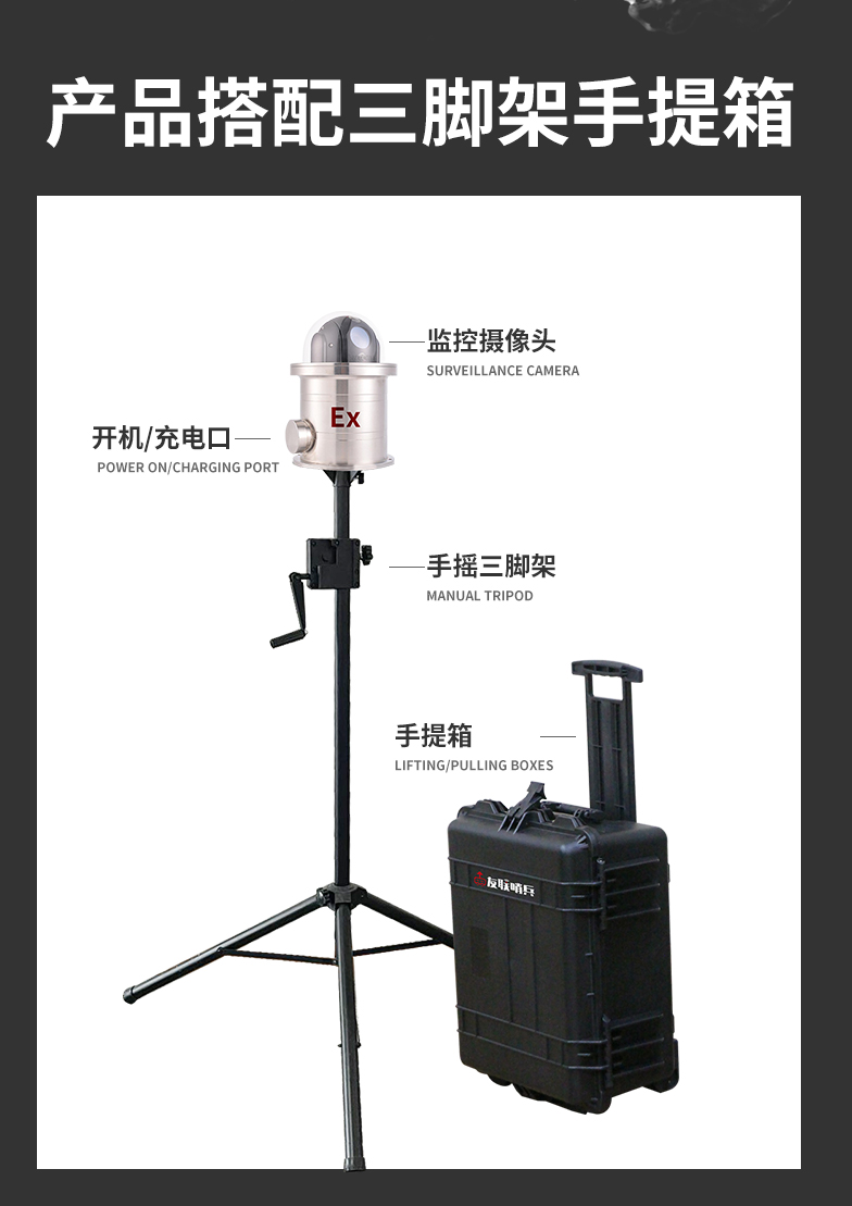 友聯哨兵4G防爆布控球是一款具備防爆功能的一體化無線視頻應急指揮系統,專為特定行業(如石油、煉化、化工、燃氣等危險化學和易燃易爆行業)設計。產品內置高清攝像機及高性能鋰電池組,通過無線網絡方式回傳至控制終端,具備防水防震防爆等特性,攜帶便捷,可快速安裝和收納,完全滿足石油、化工等作業區的移動巡檢、無人值守、臨時監控、應急指揮的應用需求。